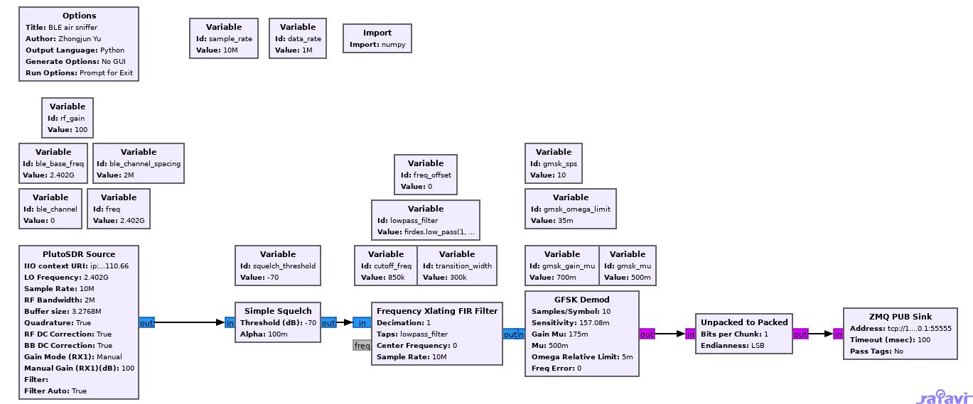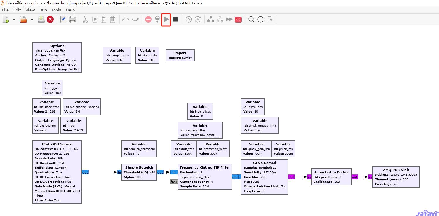 在开始介绍GNU radio的各个组件之前,我们先来看下我做的ble sniffer的整个grc文件