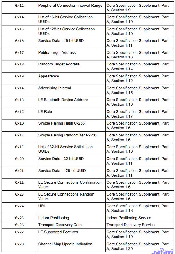 For PDU type 1 (auxiliary advertising), the PDU type dependent field (using flag bits 0x3000) is an integer bit field indicating the auxiliary advertisement type: