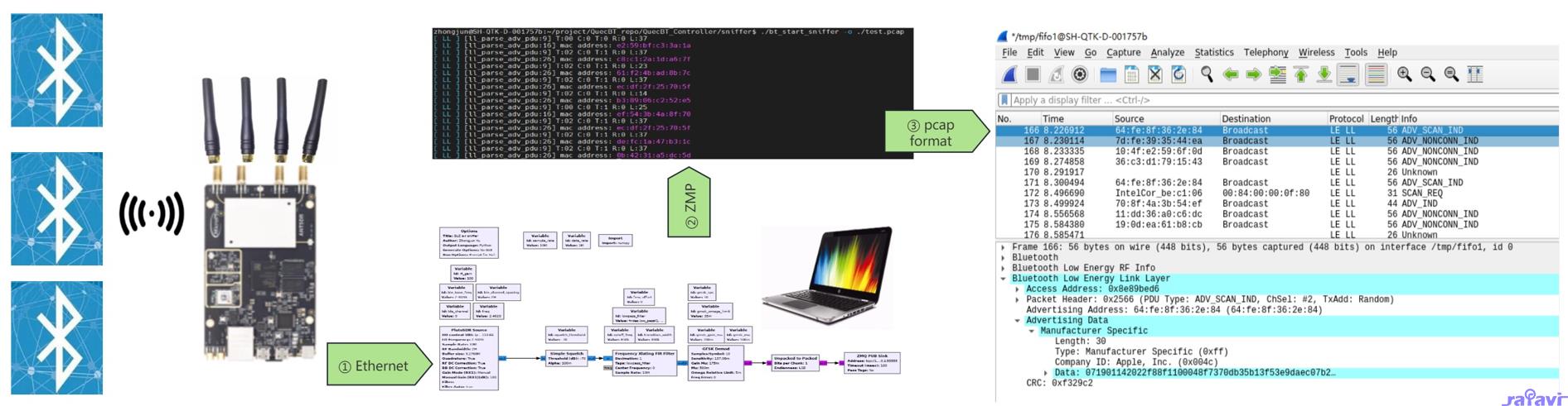 由于之前一直做蓝牙Host,对controller觉得是一个比较虚无缥缈的东西,得不到的总是在骚动,所以最近用我用吃灰了2年的SDR(Software Defined Radio)设备研究了下BLE的抓包,通过BLE的抓包了解下蓝牙的controller的一点点内容,日拱一卒,拱了2个周终于可以抓到蓝牙37通道的广播数据,并且可以把数据传送到Wireshark中。整份工程是C语言+gnu radio来完成,没有借用python等。为什么选用C语言而不用python呢,因为我是想着做完这个找到灵感,是不是可以直接用SDR做蓝牙芯片了(哈哈,愿景哈)