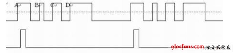 观测上面的信号,由于 ABCD 各点都会触发,示波器显示波形将不能稳定。这时可以使用 下面的信号作为触发信号,示波器将得到能够全部周期的显示。